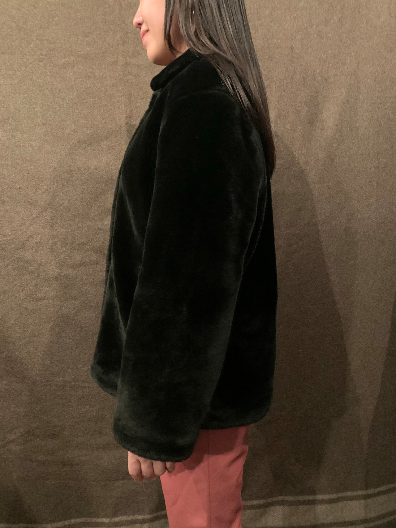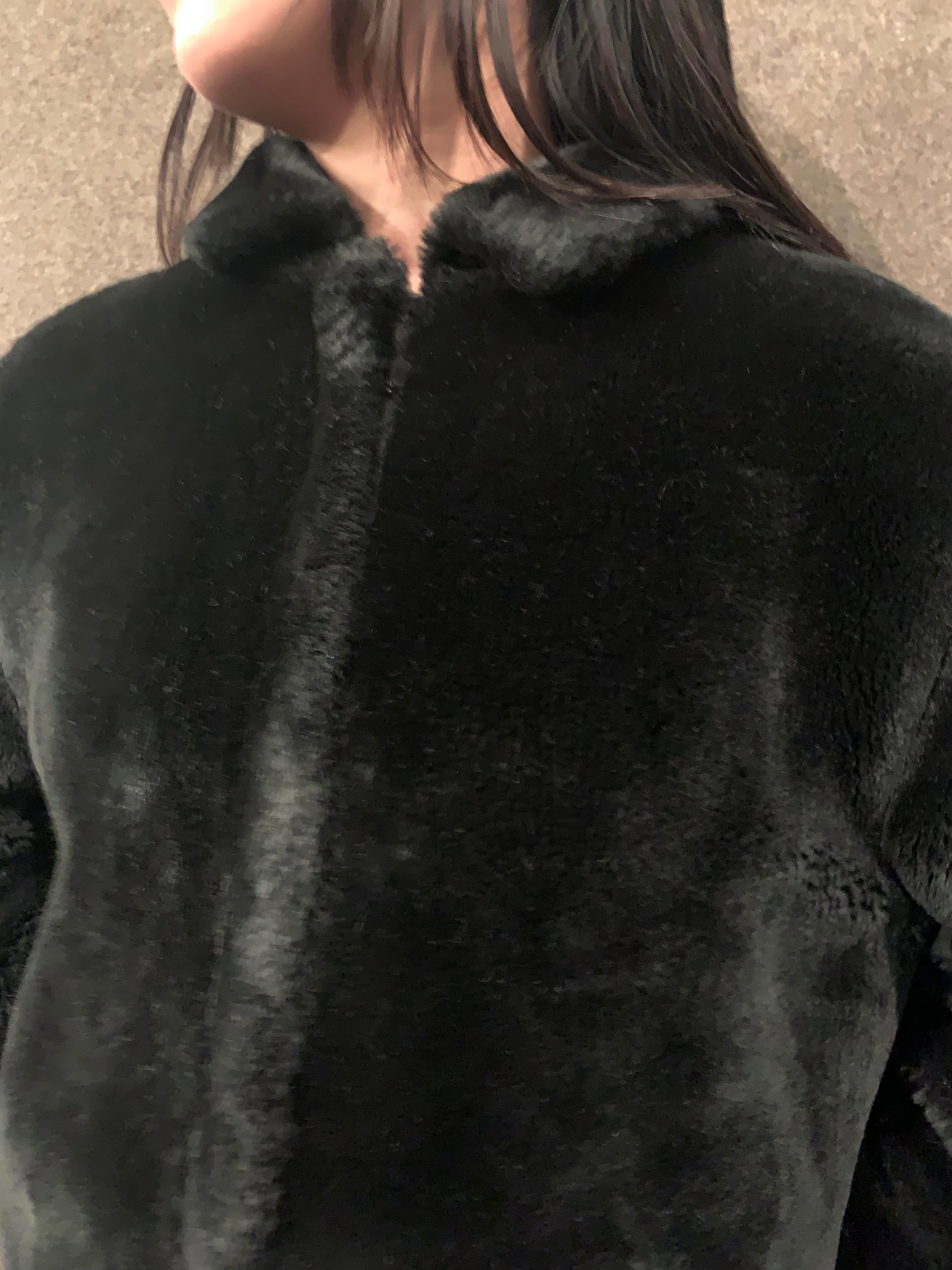 モコモコとしたファーに襟付きのデザインが可愛いジャケット。オールブラックにボックスシルエットのブルゾンのようなシルエットにすることで可愛過ぎない程よいバランスです。