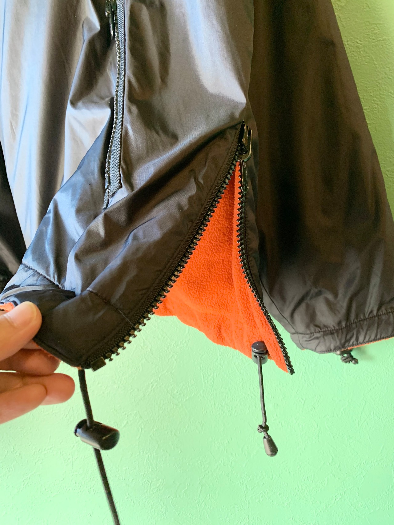 A面がブラックカラーのナイロン地に裾にはジップポケットのついたデザイン。
