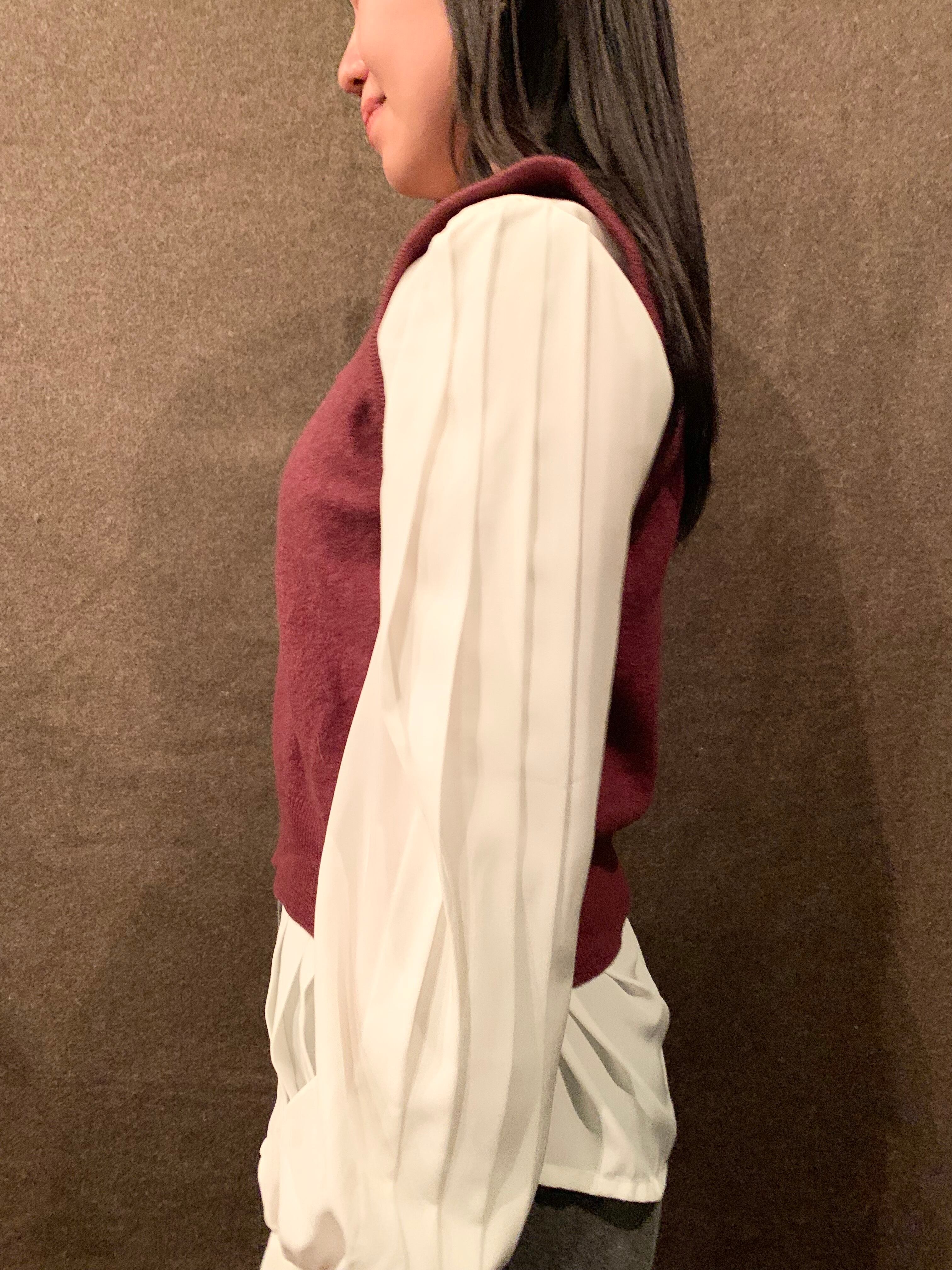 シックなボルドーカラーに左胸にはワンポイントブランドロゴの入ったベスト。