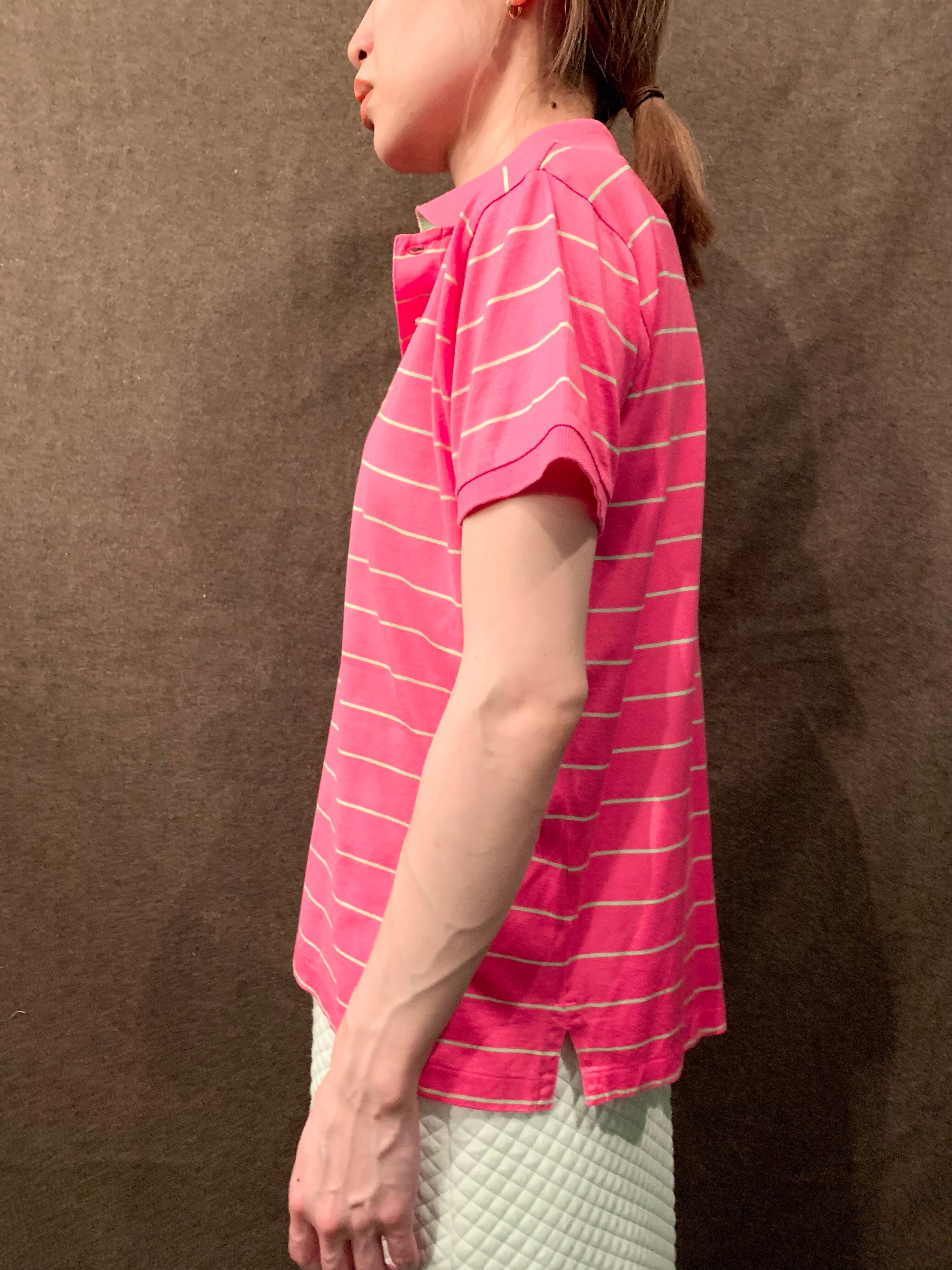 可愛らしいビビッドなピンクカラーに細ピッチの黄緑のボーダーがアクセントとなっています。鹿子ではなくサラッとしたカットソーのような柔らかい生地です。