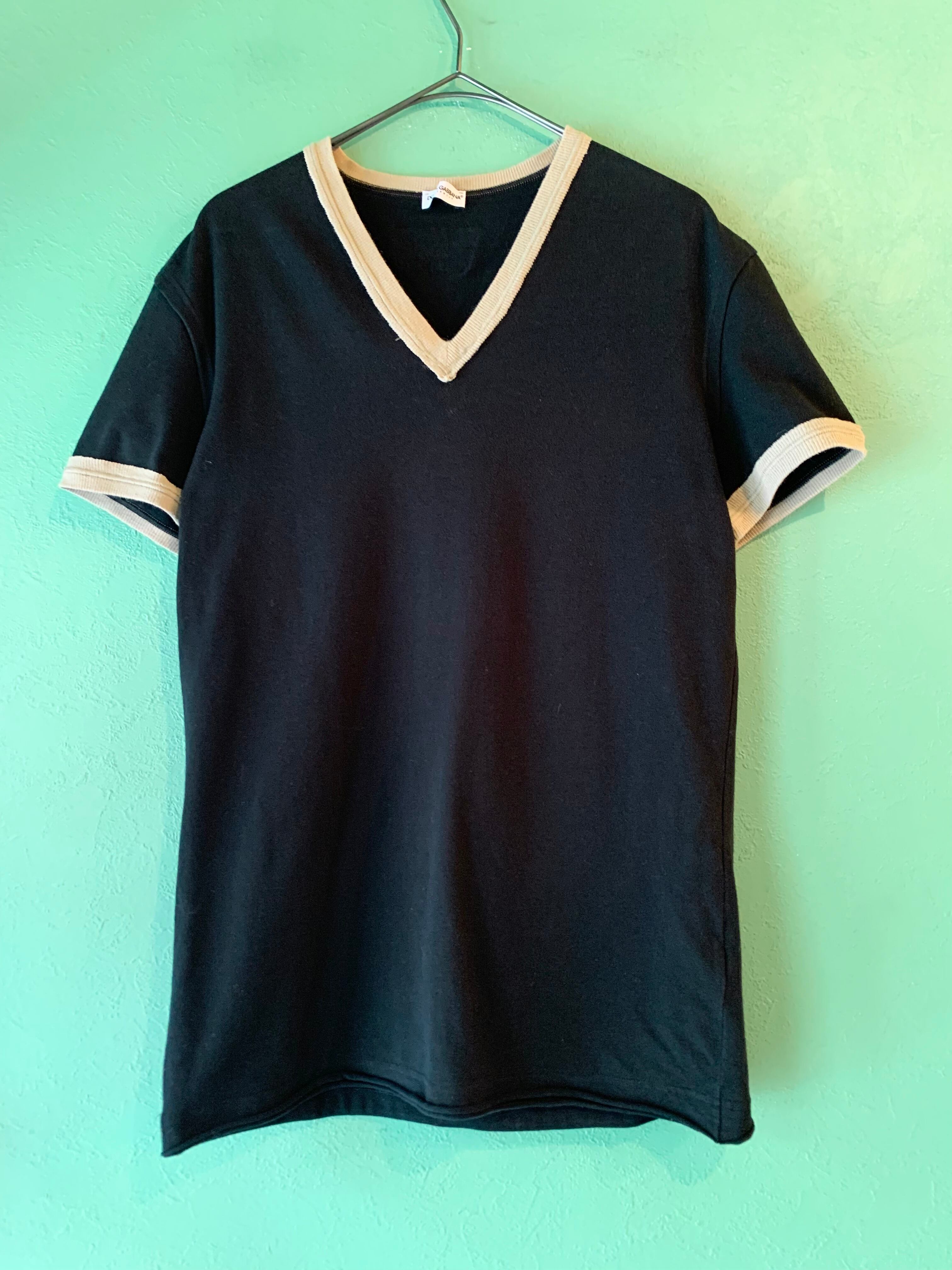 通常リンガーTeeは丸首ですが大人っぽいVネックにハイブランドらしいブラックカラーにベージュのパイピングがアクセントになっています。