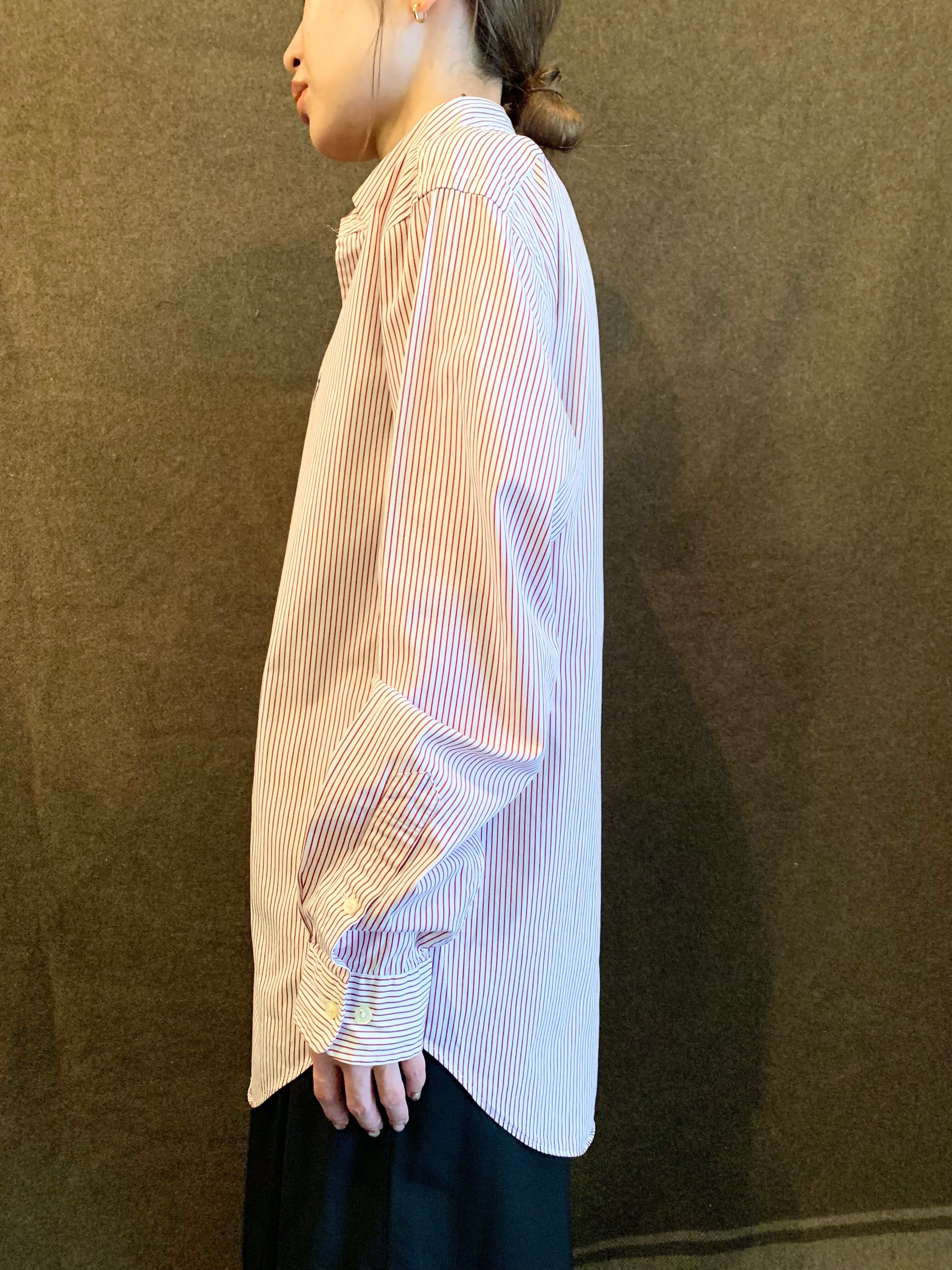ホワイト×レッドの可愛らしいストライプパターン。クラシックなボタンダウンにストライプパターンですがカジュアルなカラーリングにより程よいカジュアルダウンされています。