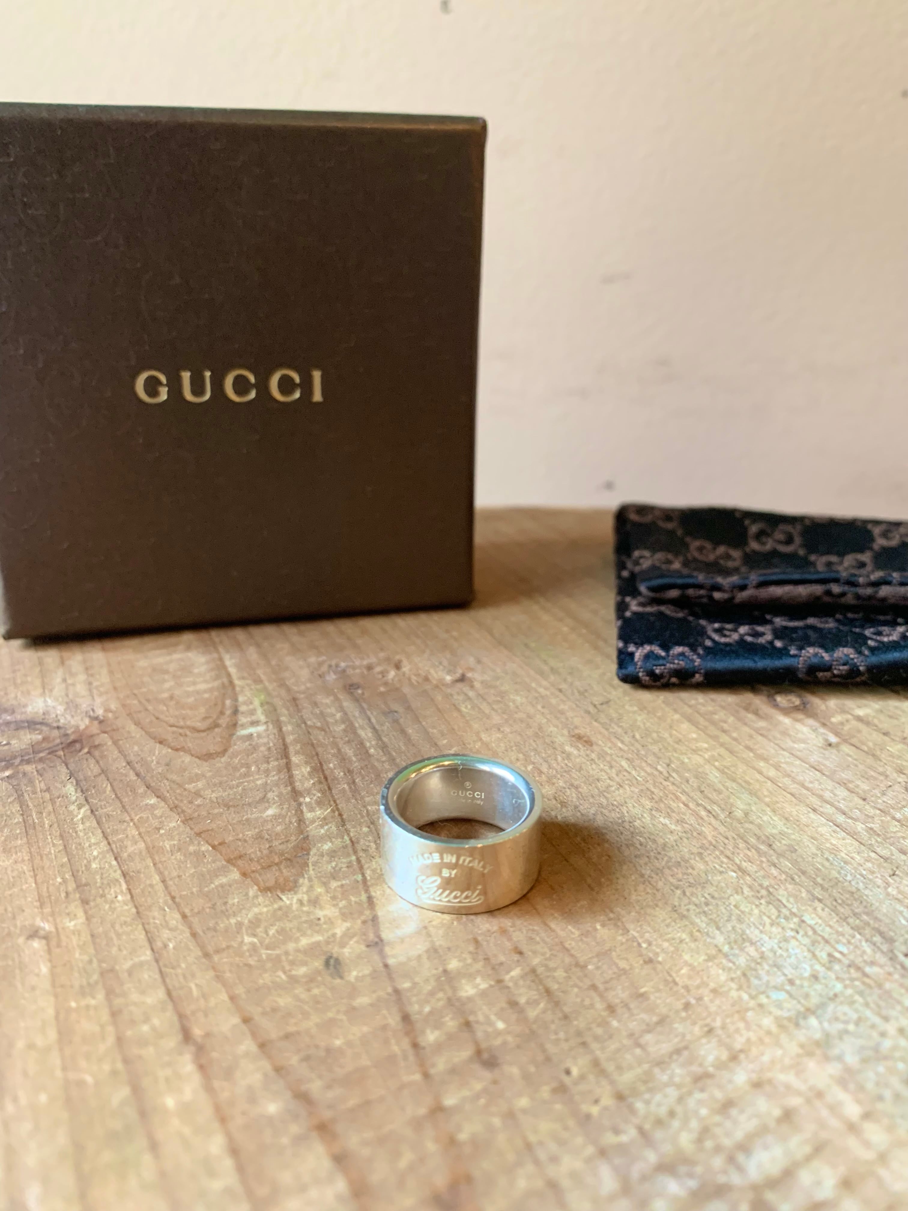 こちらは可愛らしいフォントでブランド刻印のされたシルバーリング。