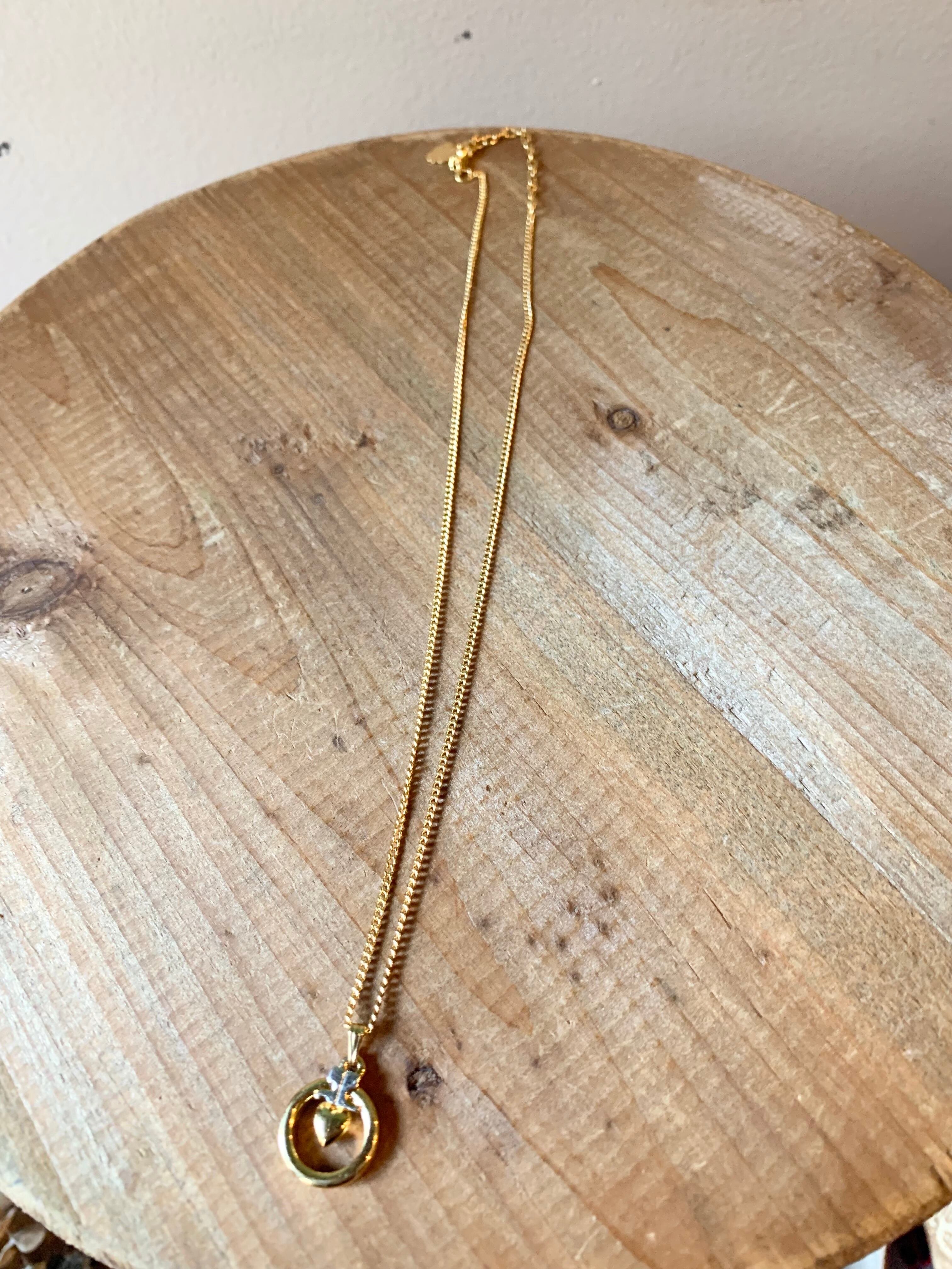こちらはシルバーカラーのロゴマークにゴールドのハートモチーフを円で囲った可愛いデザインのネックレス。