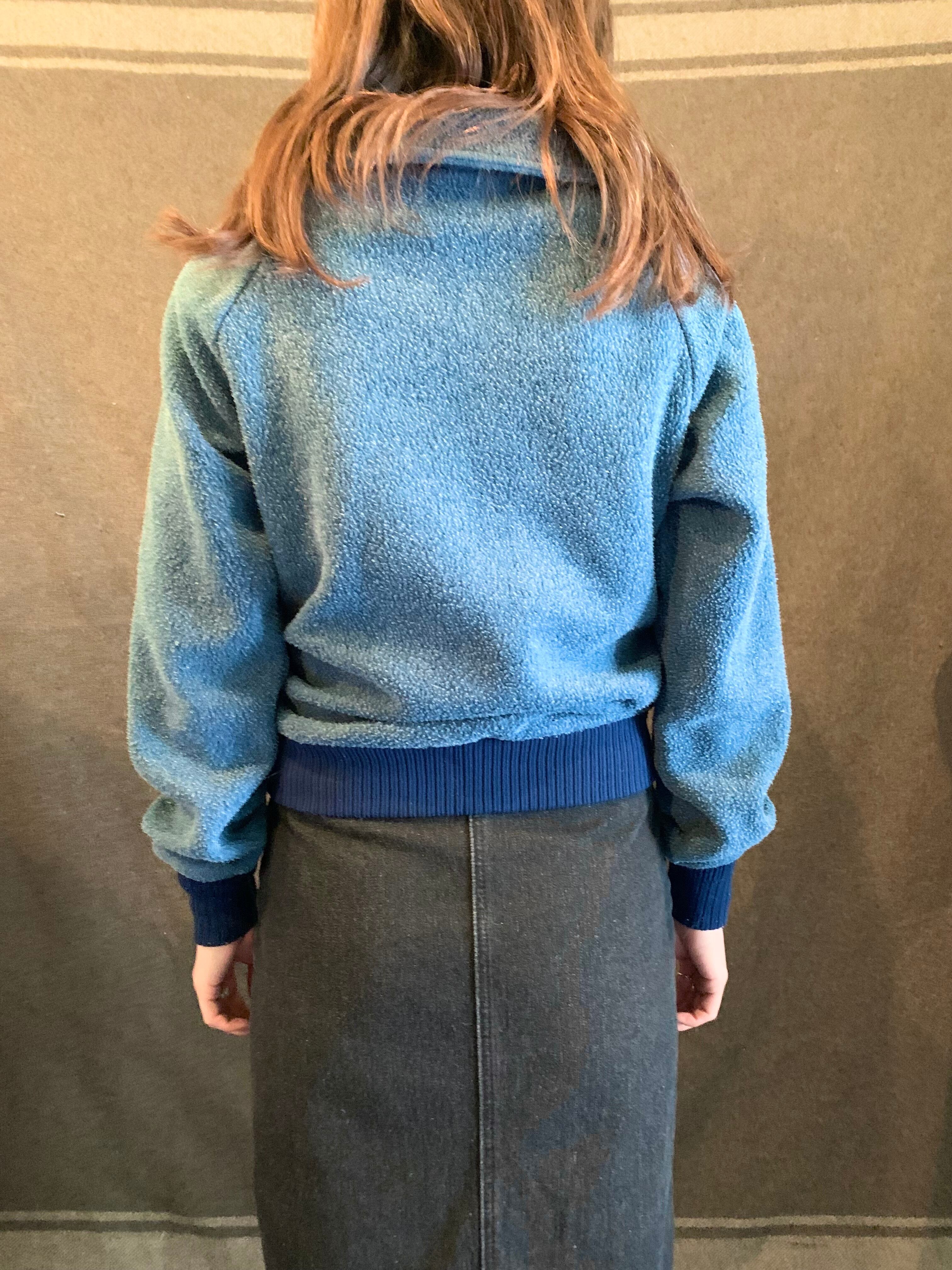 くすんだブルーカラーに裾、袖がネイビーカラーに切り替わった可愛いカラーリングになっています。