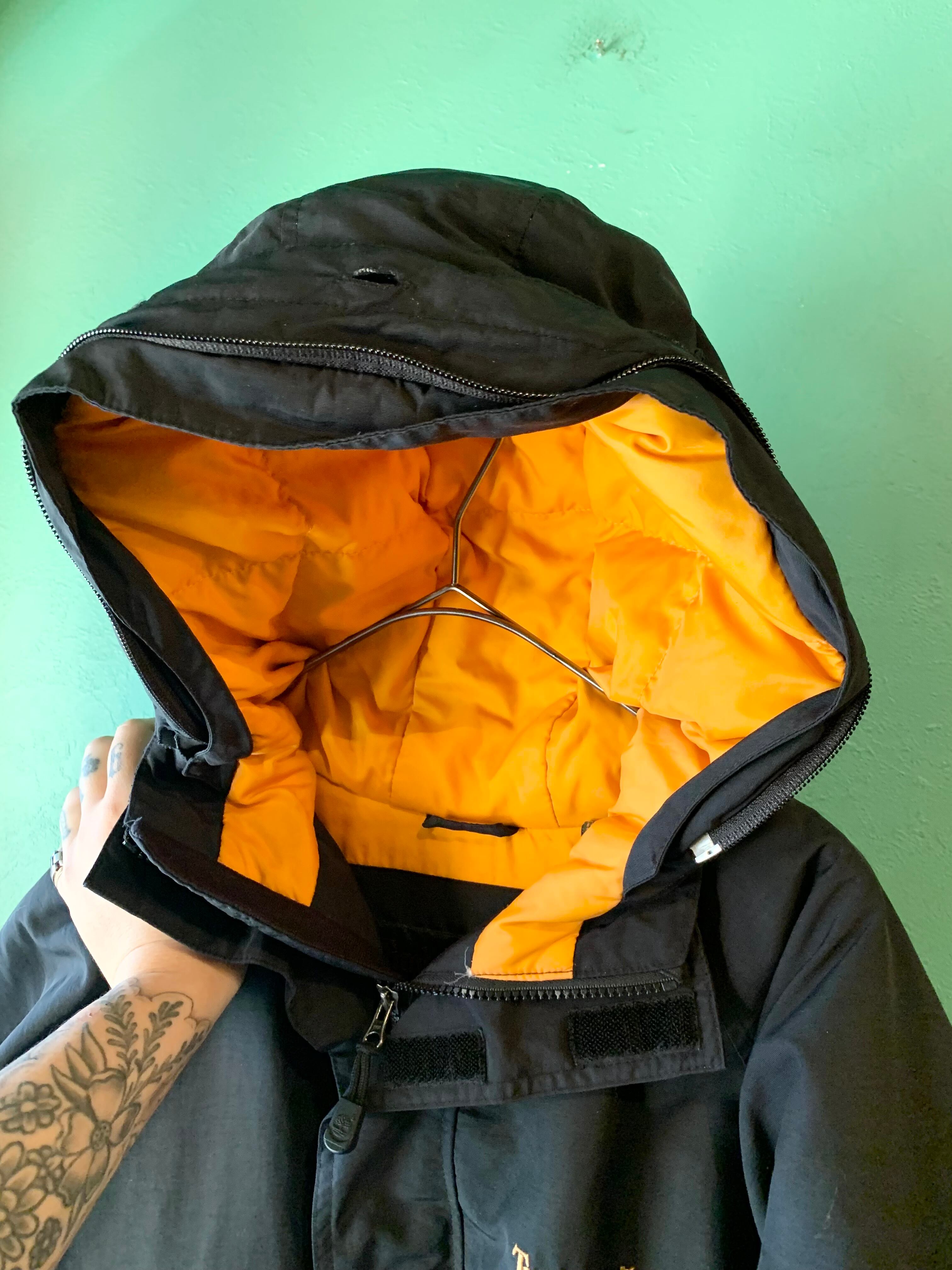 こちらは使い勝手の良いブラックカラーのダウンジャケット。2001年のアイテムで左胸、左腕ポケット、背面にさりげないブランドロゴ刺繍がアクセントとなっています。