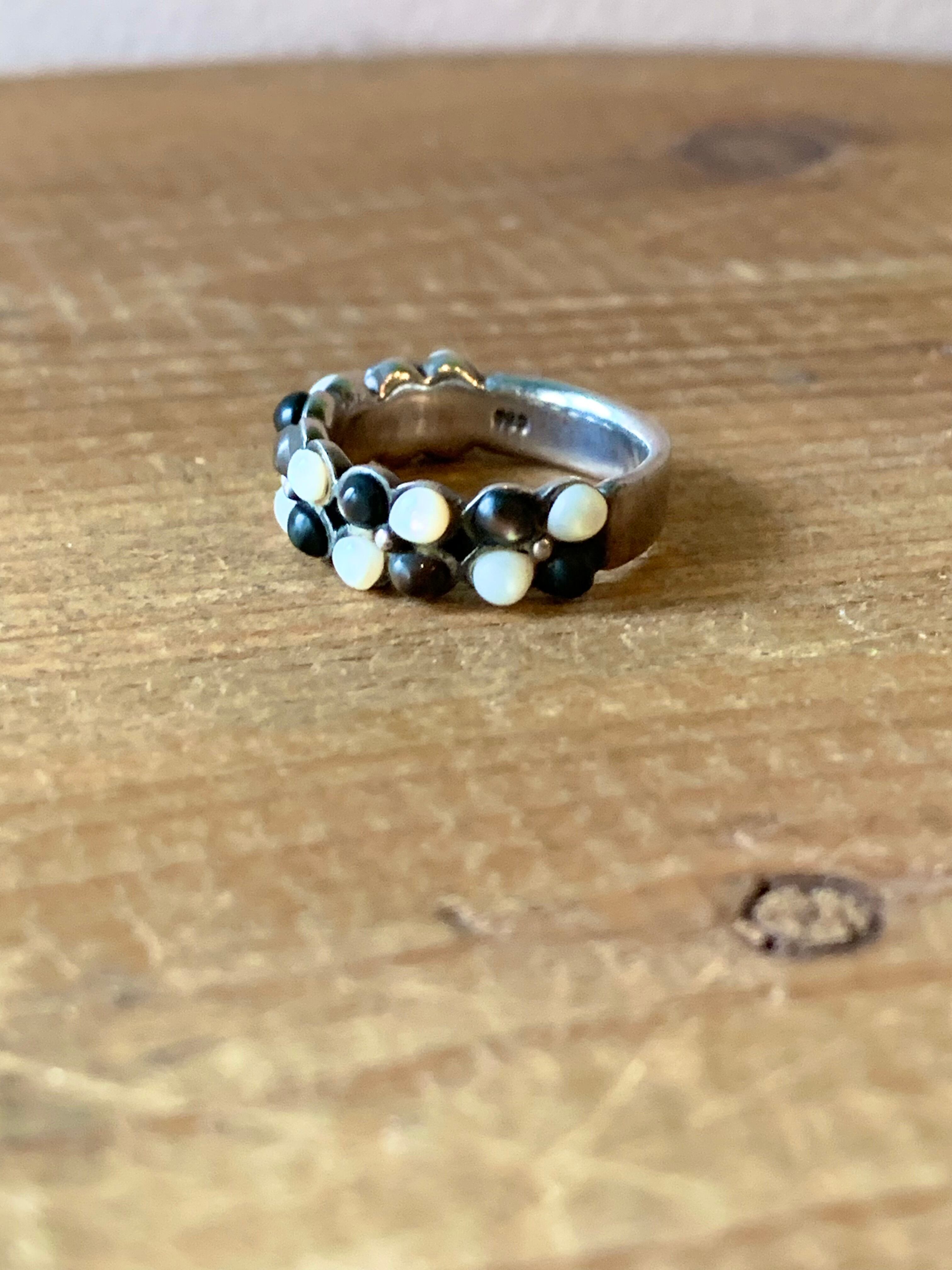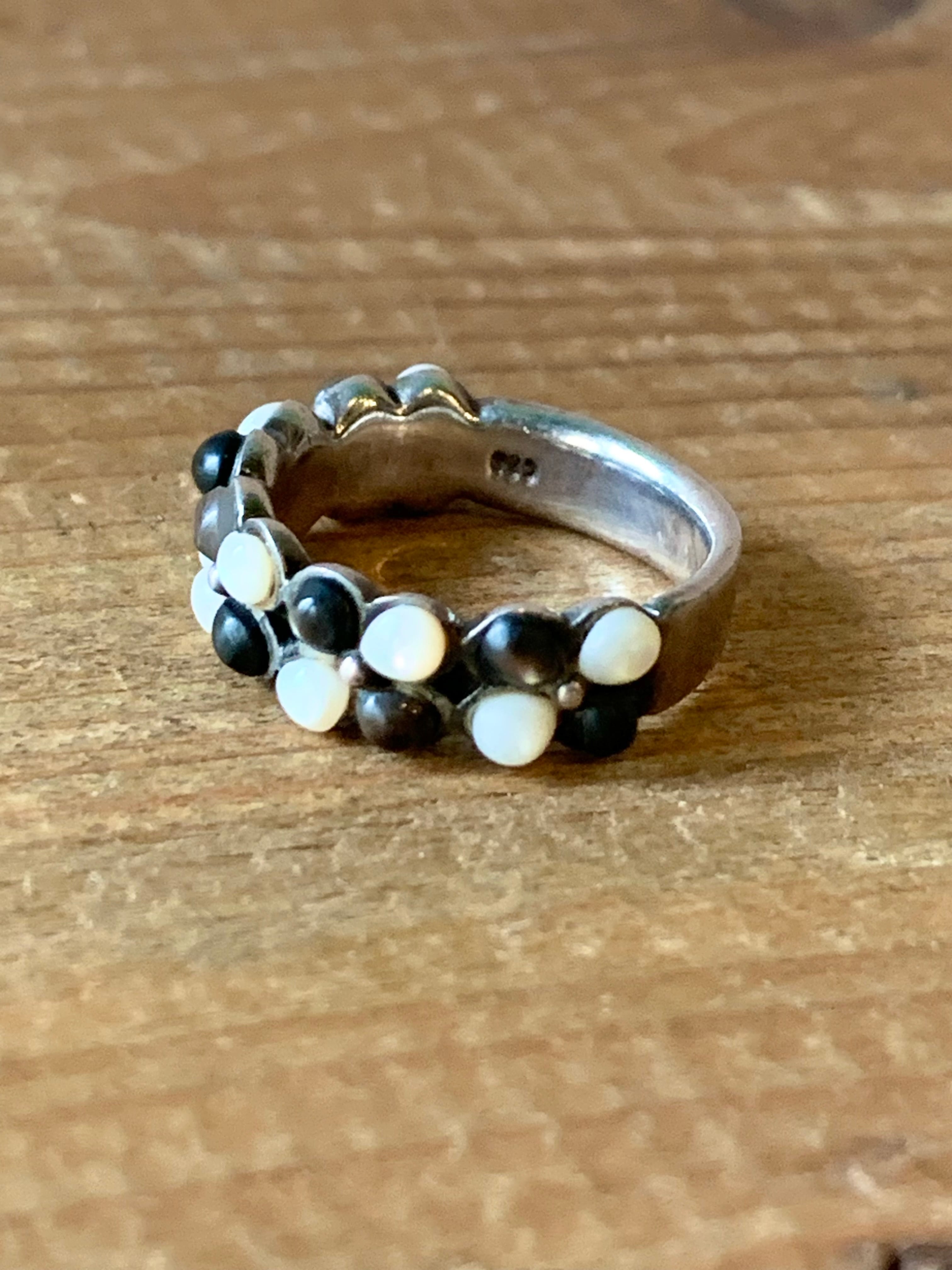 こちらはモノトーンベースの石が多数付けられたレトロデザインリング。
