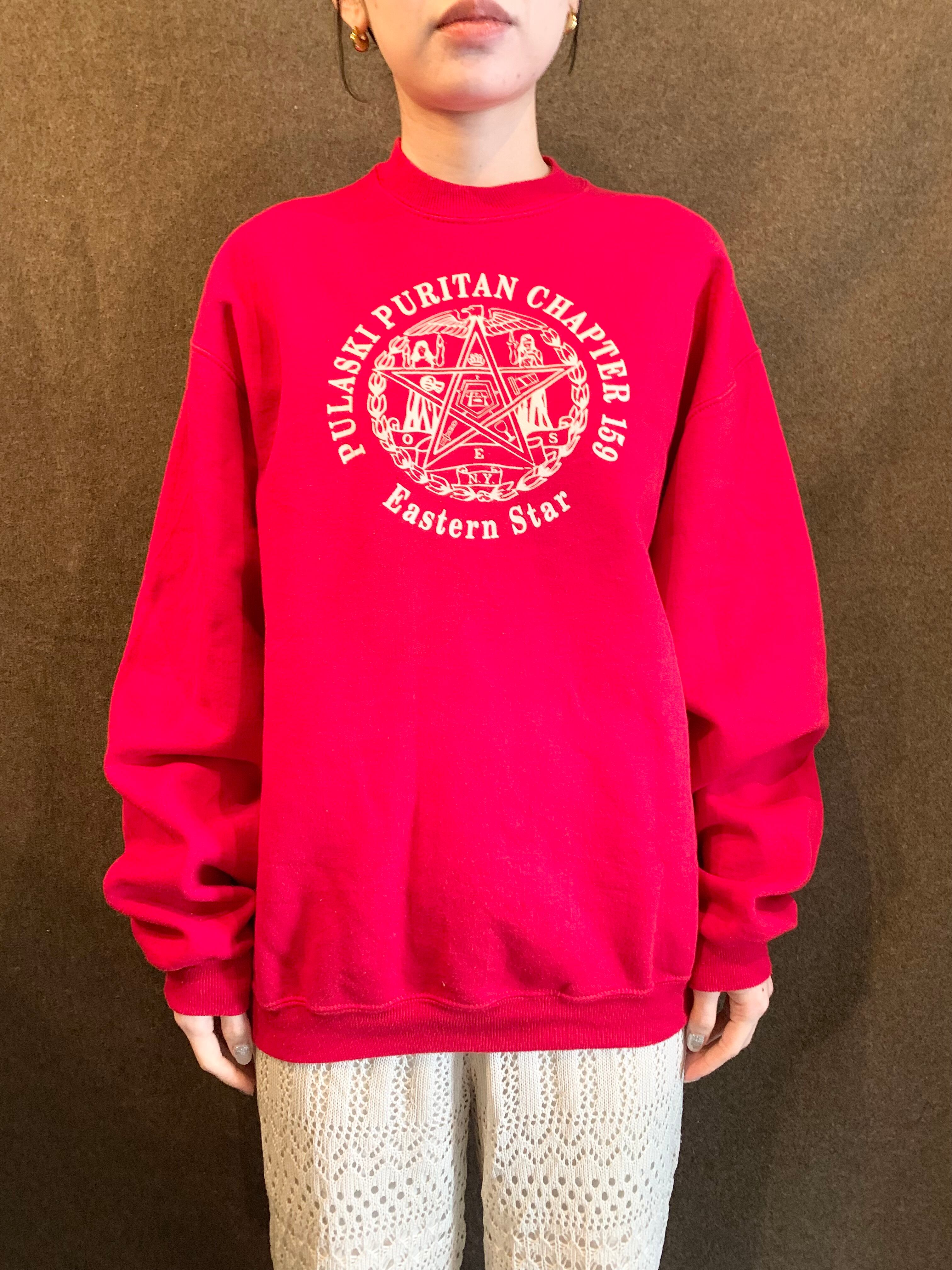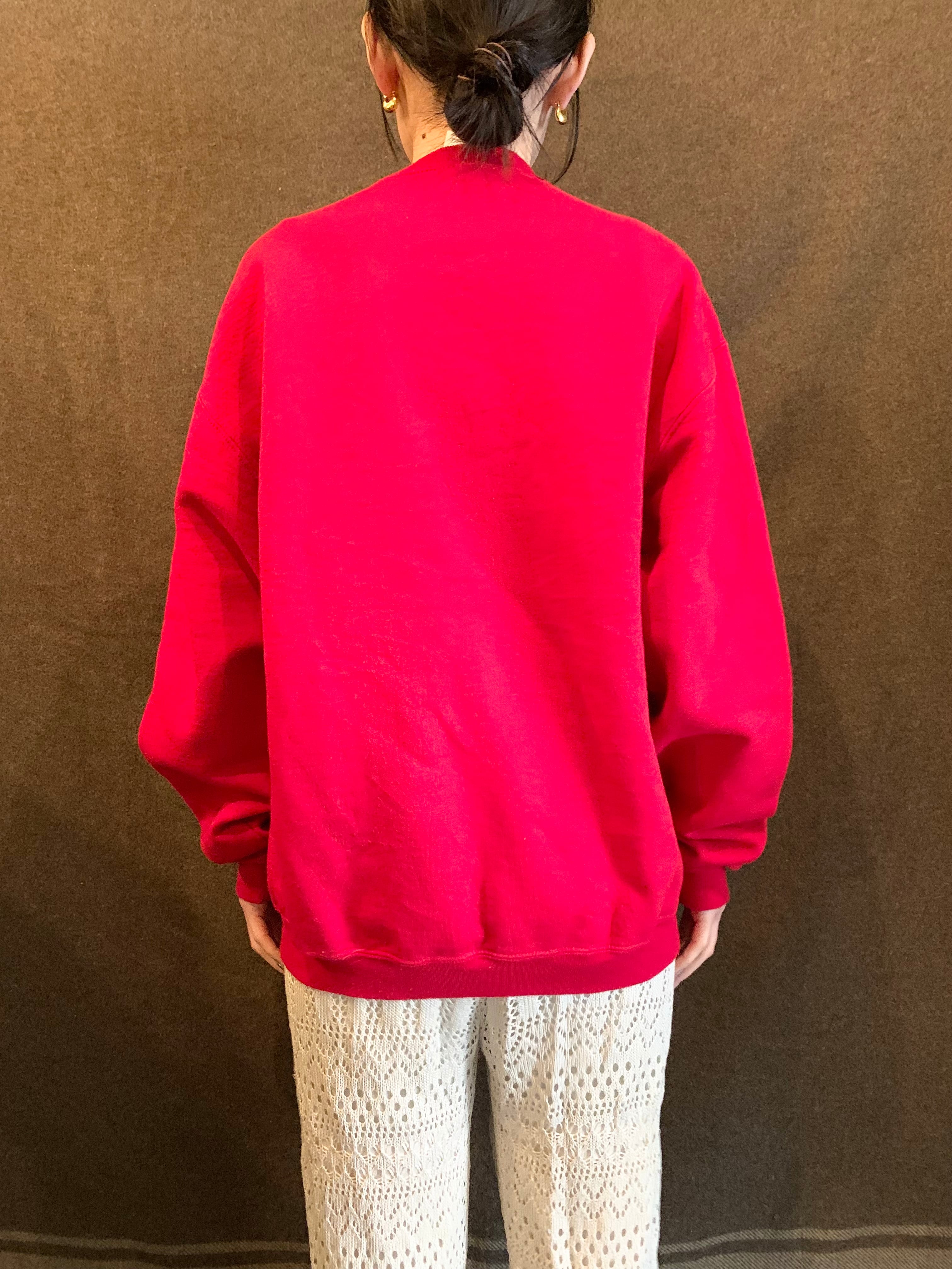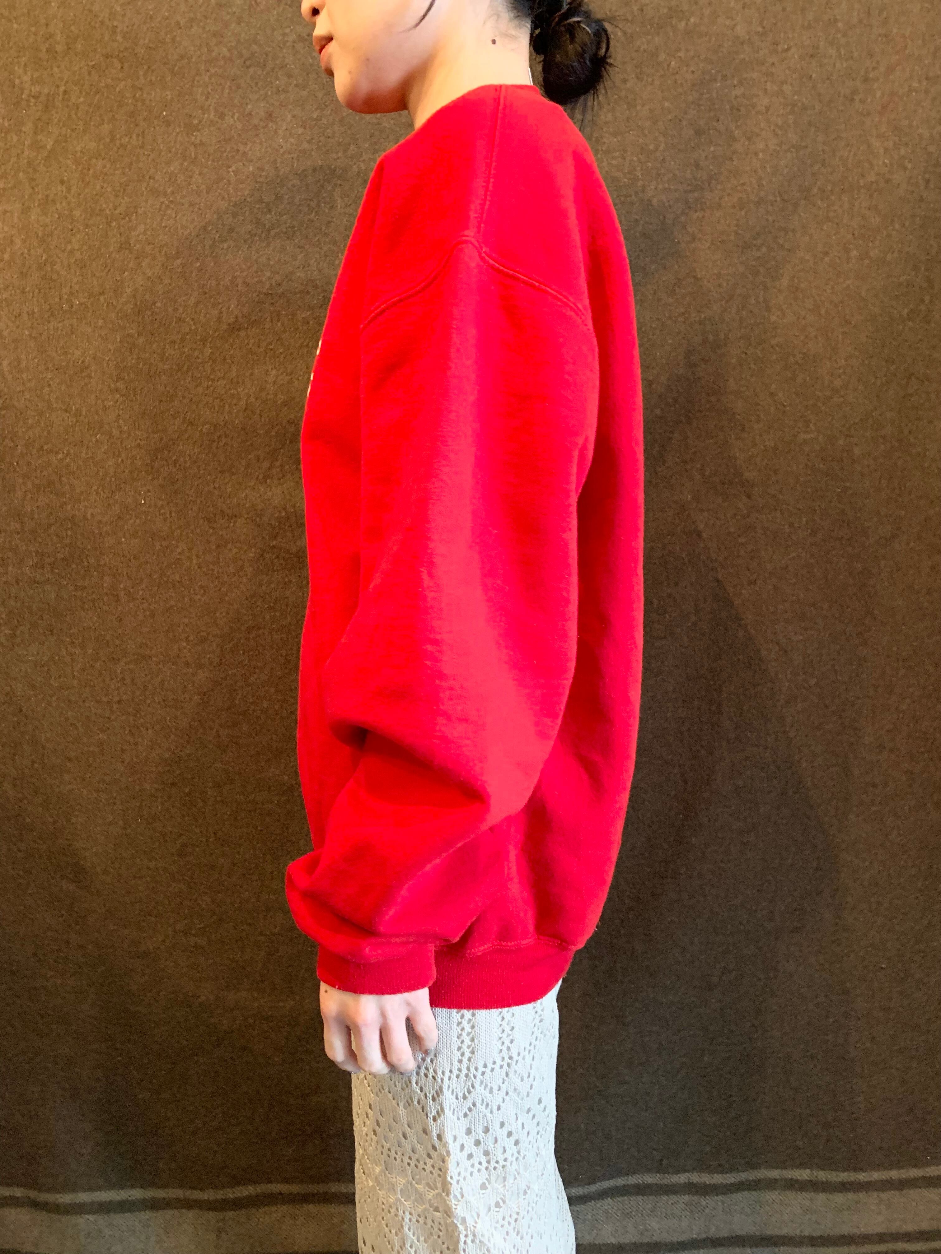 こちらはビビッドなレッドカラーの可愛いスウェットシャツ。