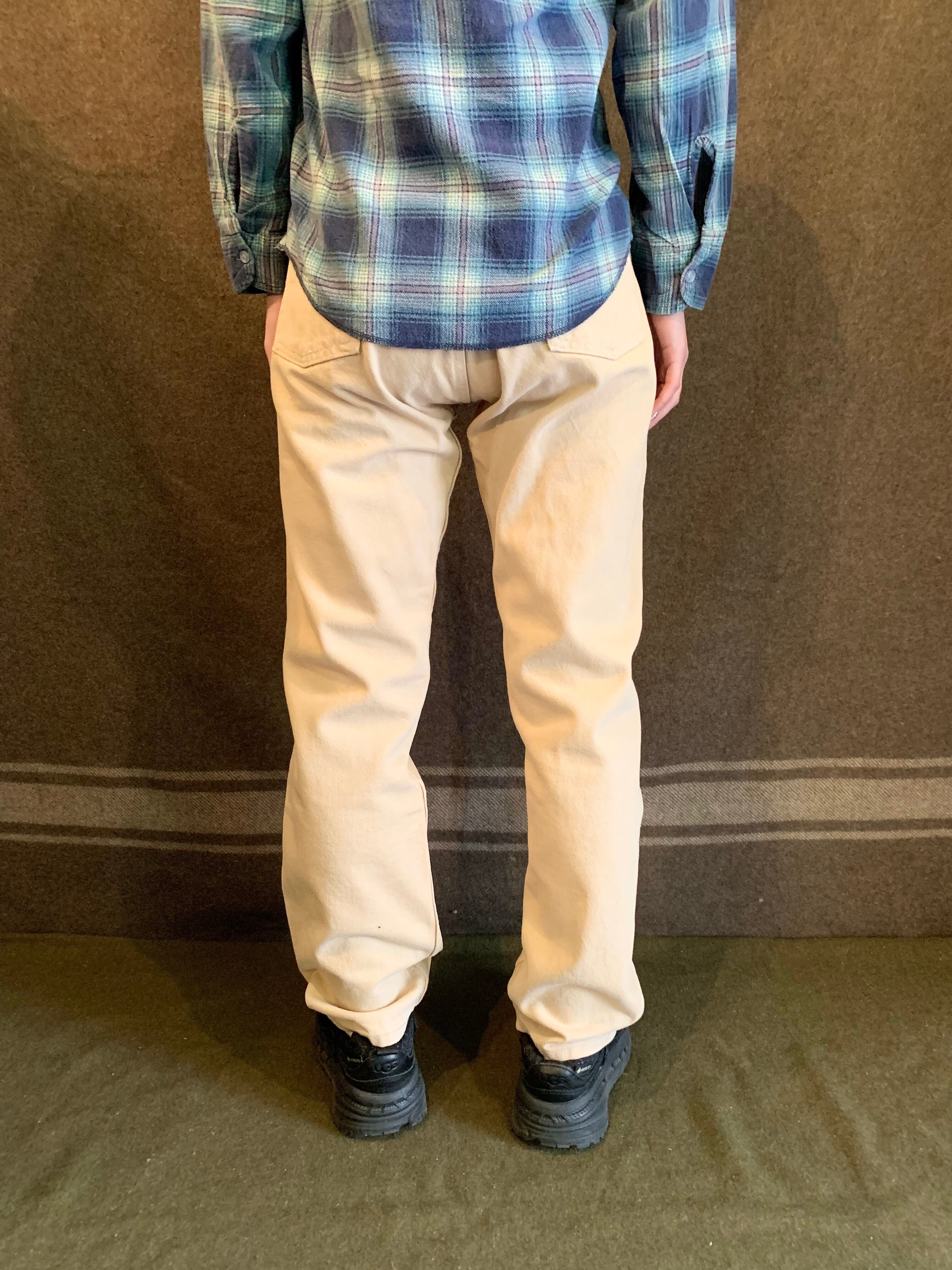 ベージュに先染めされた、まるでチノパンのようなパンツです。