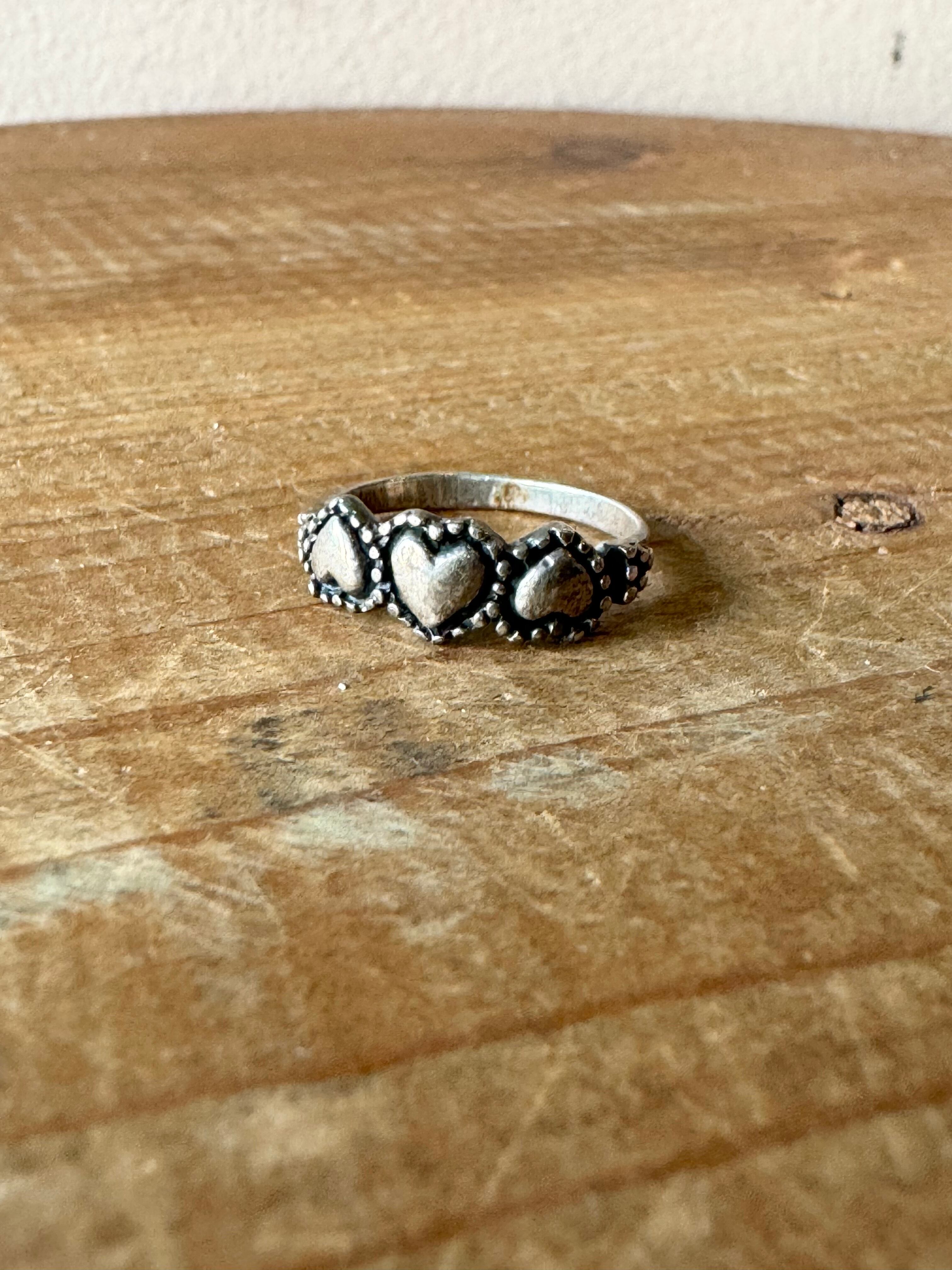 こちらは小ぶりなハートが3つ連なった可愛いデザインリング。華奢で控えめなデザインなのでどんなスタイルにも合いやすいかと思います。