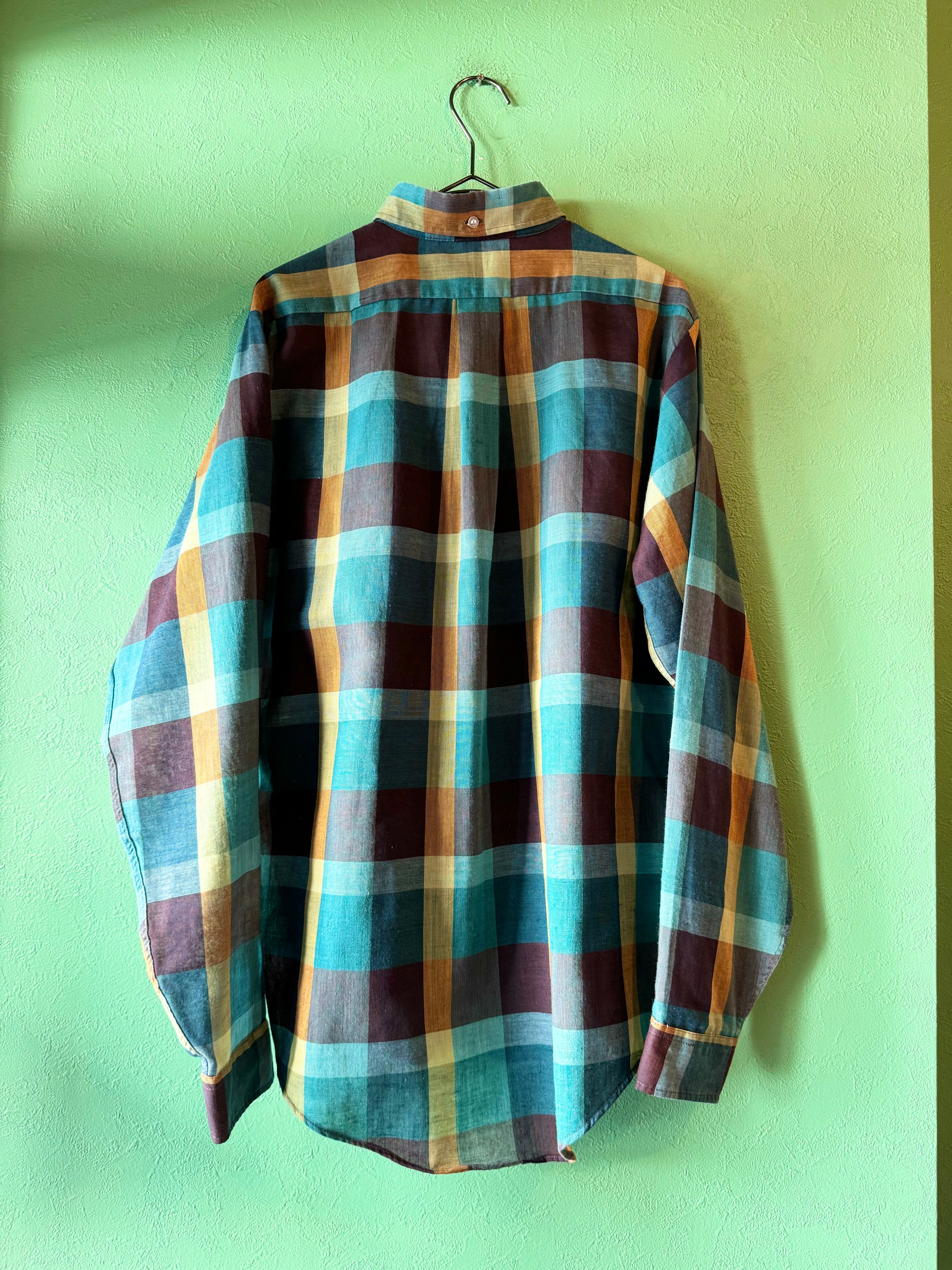 こちらはブルー×エンジ×イエローのマドラスチェックパターンにクラシックなボタンダウンデザインとなったアイテム。