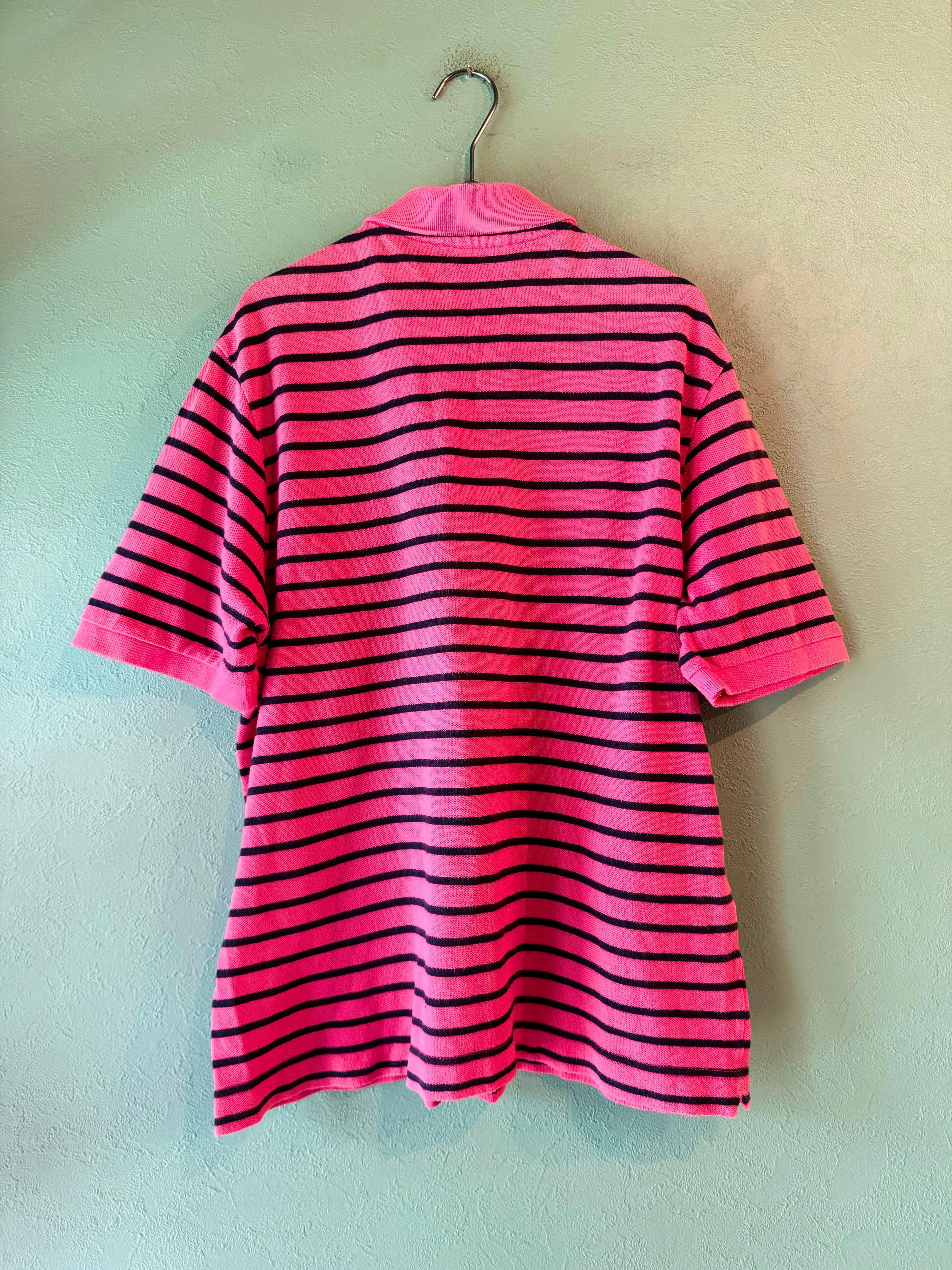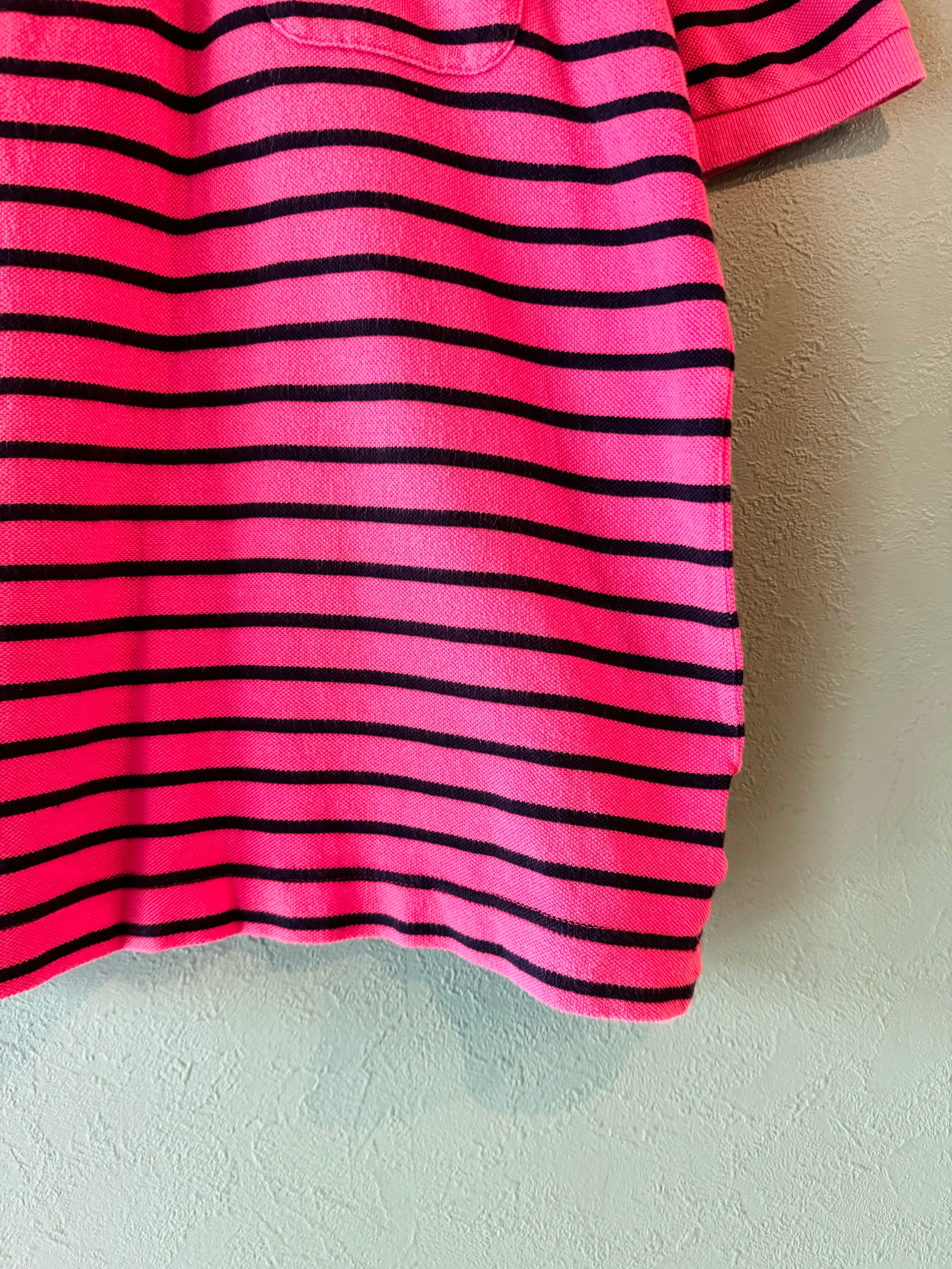 こちらはビビッドなピンク×ダークネイビーのボーダーパターンになったポロシャツ。