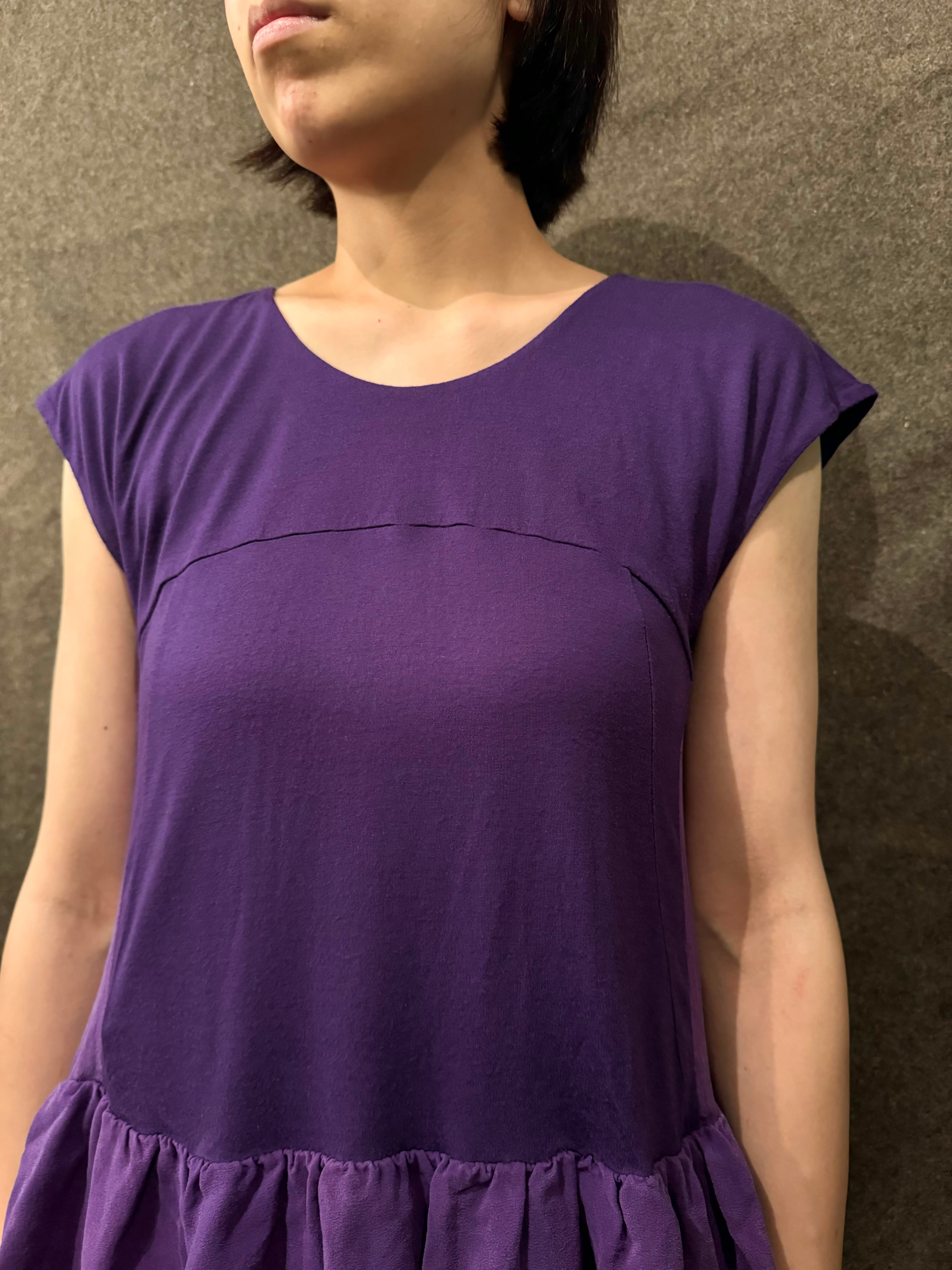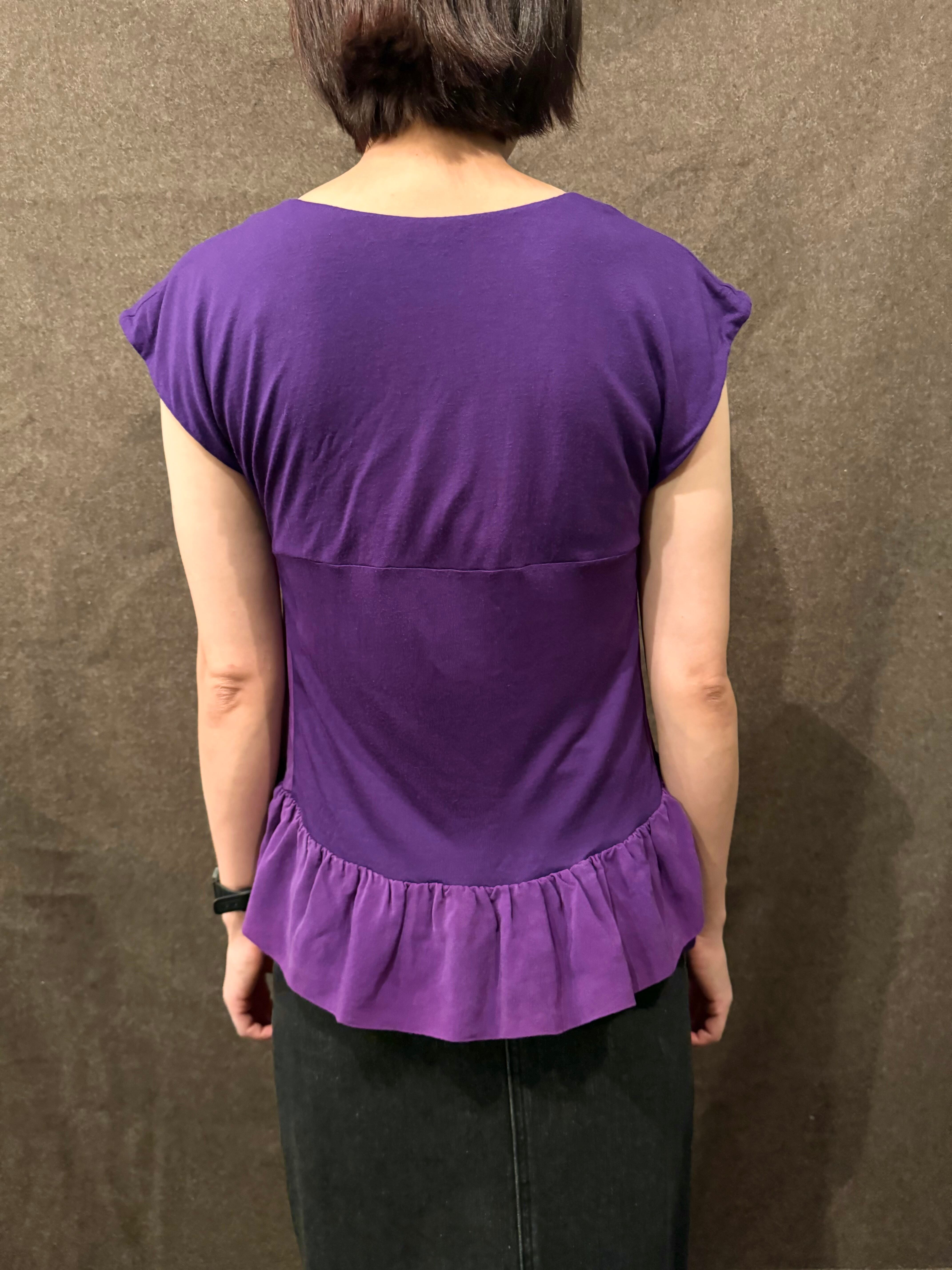 こちらはシックなパープルカラーに裾には可愛いらしいフリルデザインになったトップス。