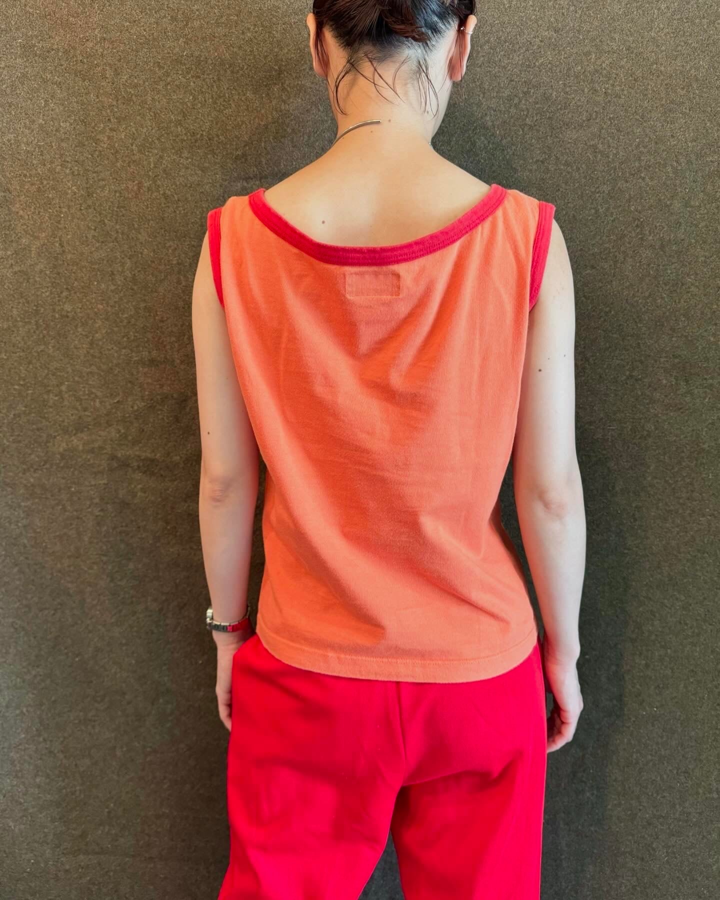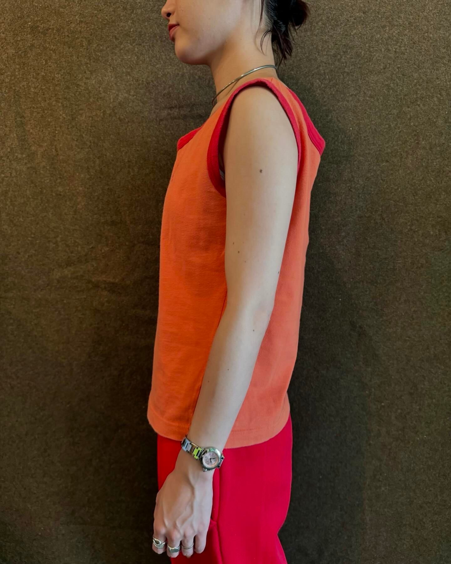 元気が出るようなビタミンカラーの組み合わせで一枚で様になるノースリーブトップスかと思います。