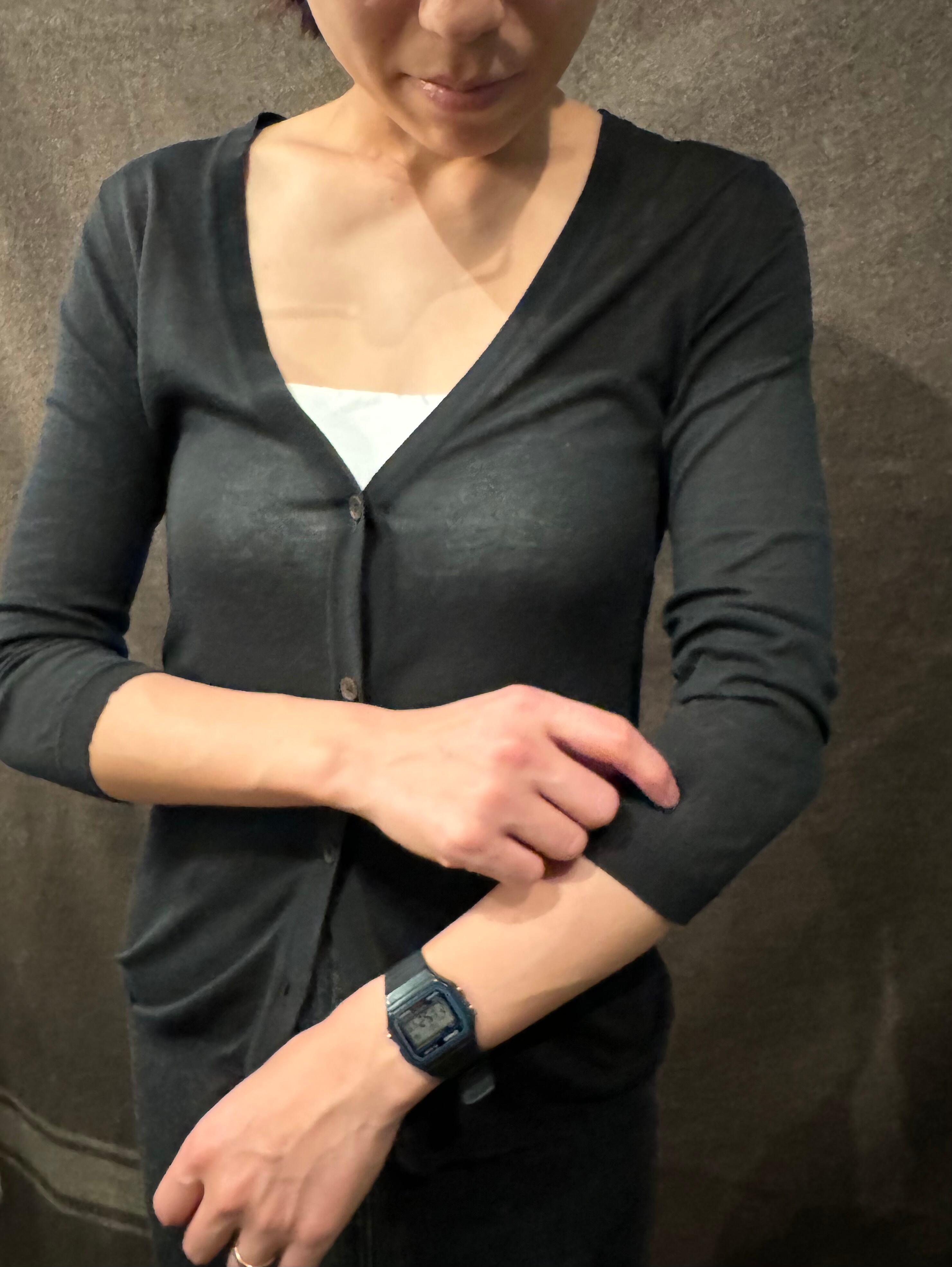 繊細なハイゲージ織りにベーシックなシルエット、袖が8分くらいの絶妙な長さも可愛いです。