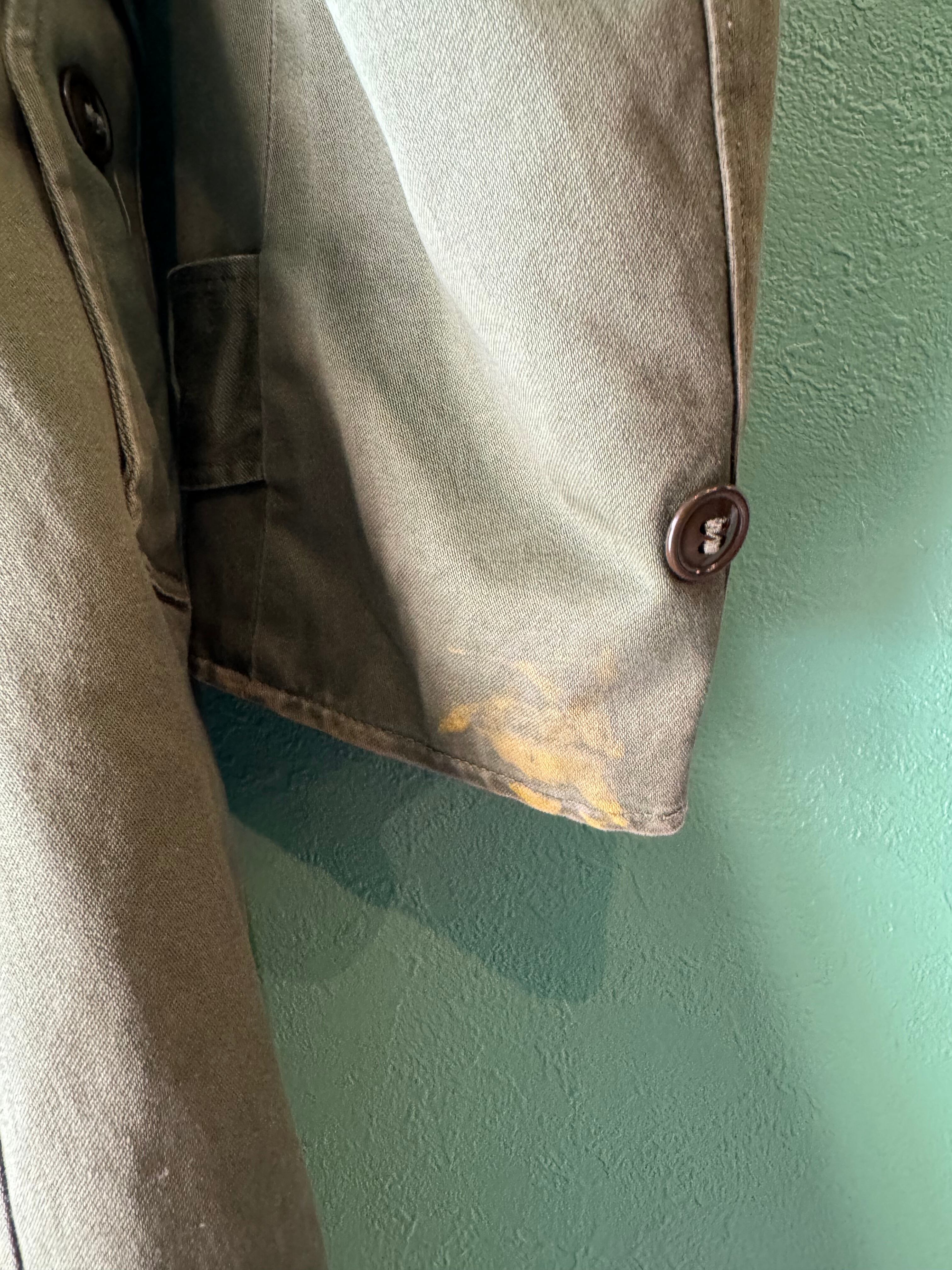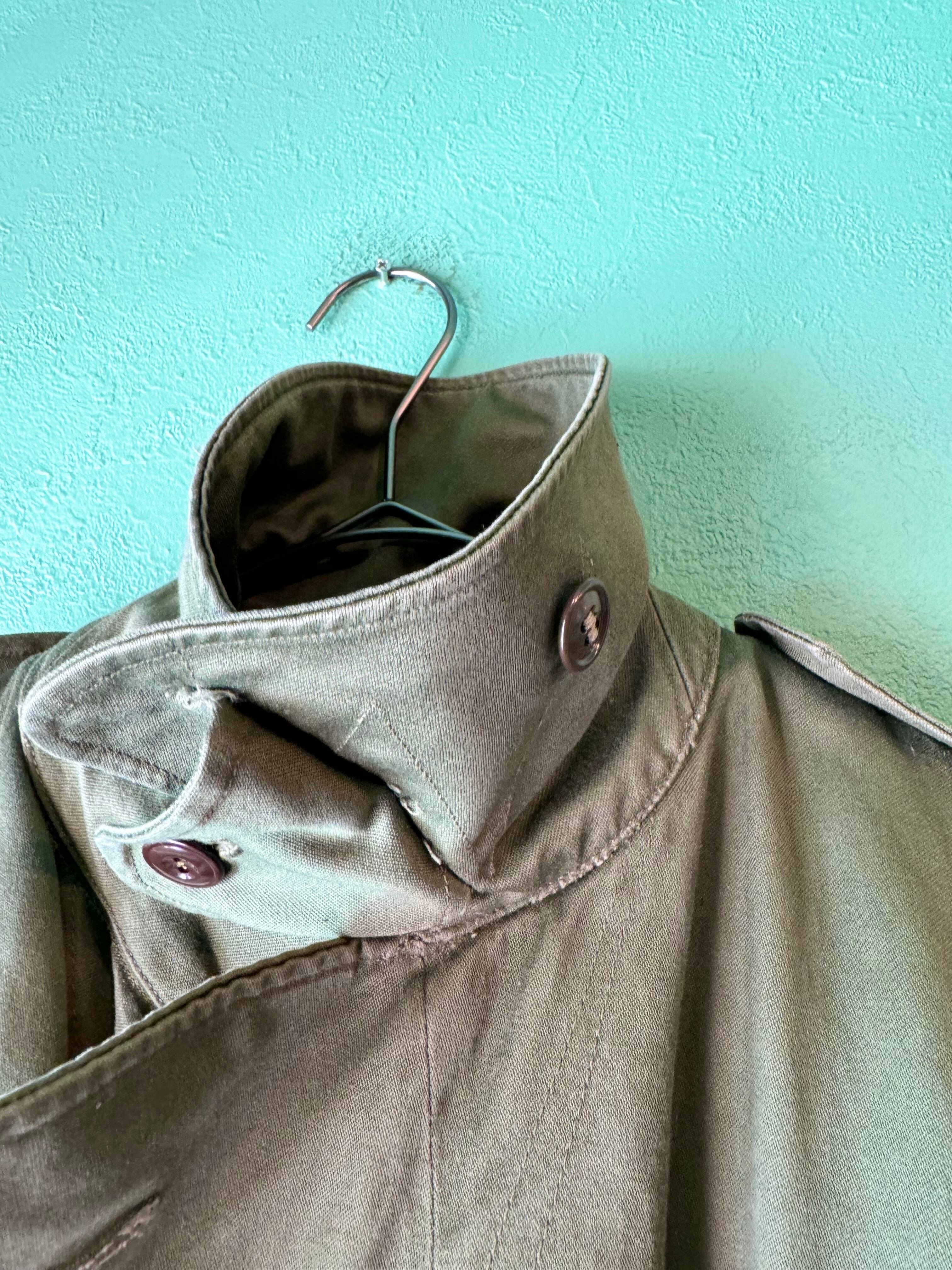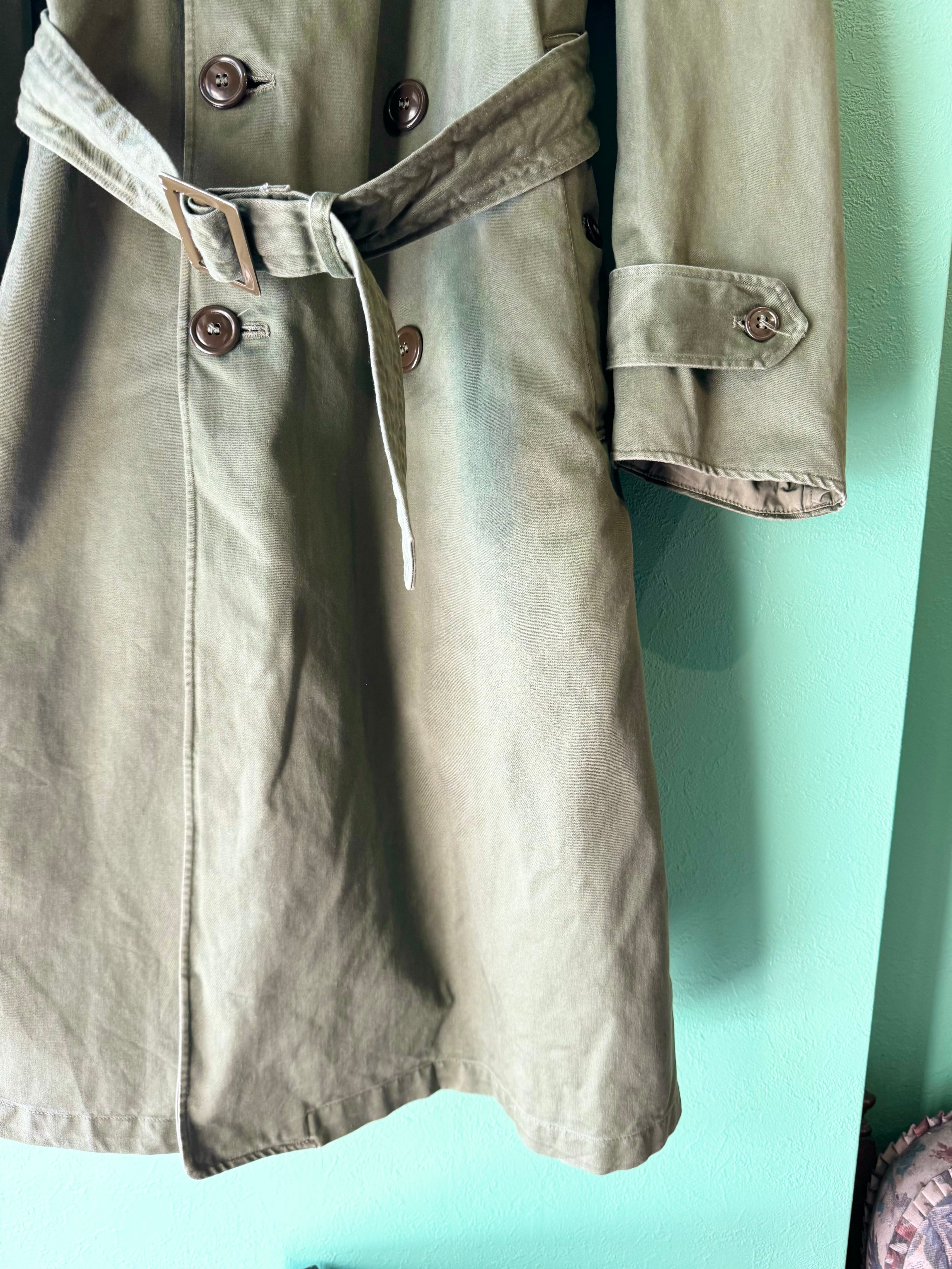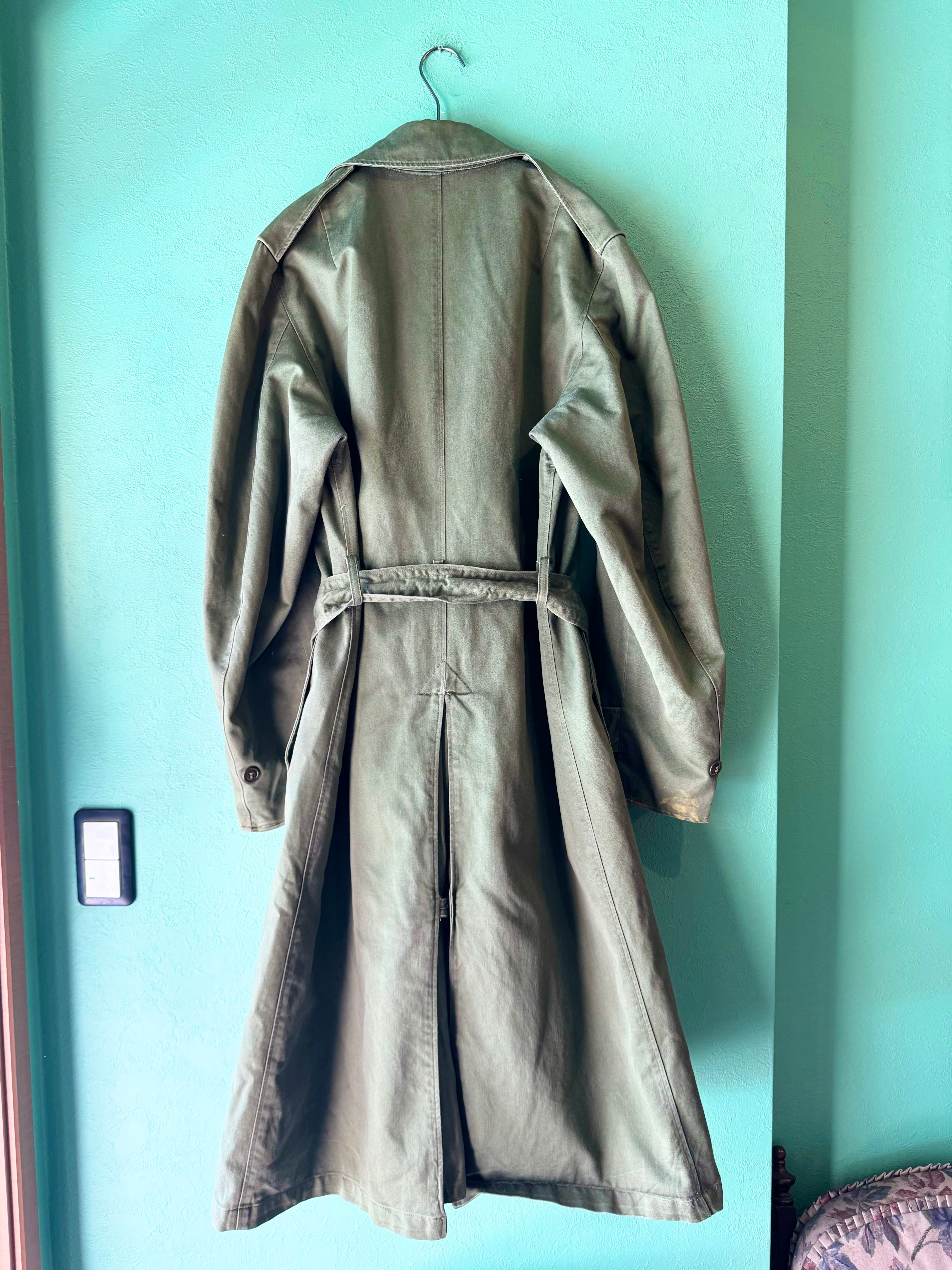 軍物ならではの風合いあるオリーブカラーにクラシックなトレンチコートデザイン、厚手で耐久性、耐水性のあるコットンサテン素材を使用しています。