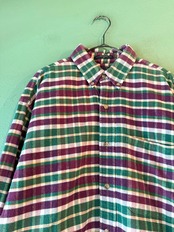 こちらはパープル×グリーン×ホワイトによく見るとイエローも混ざって可愛いらしいカラーリングのチェックパターンシャツ。