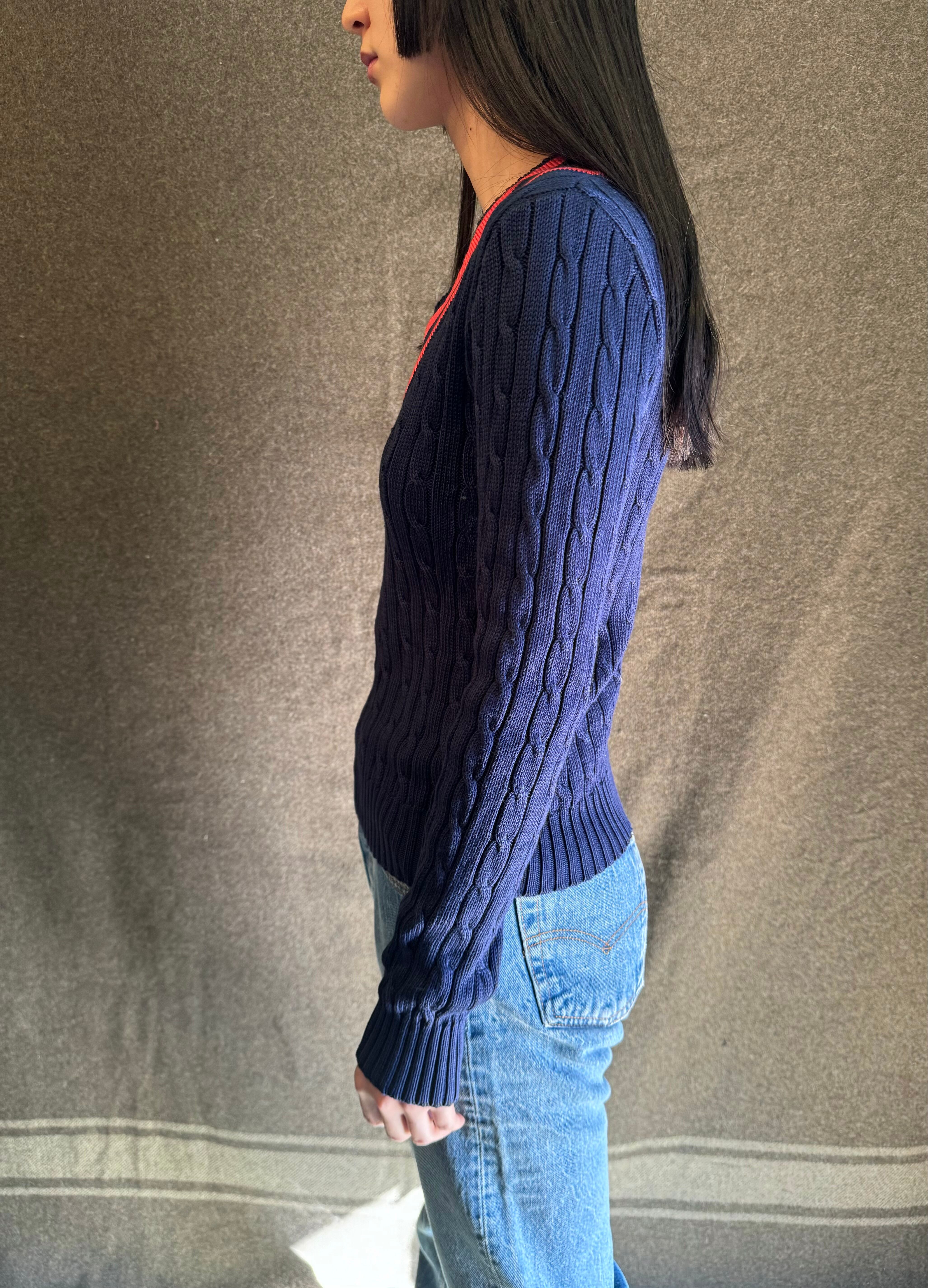 こちらはネイビーボディーのケーブル編みにオレンジのフロントVデザインがアクセントになったニット。